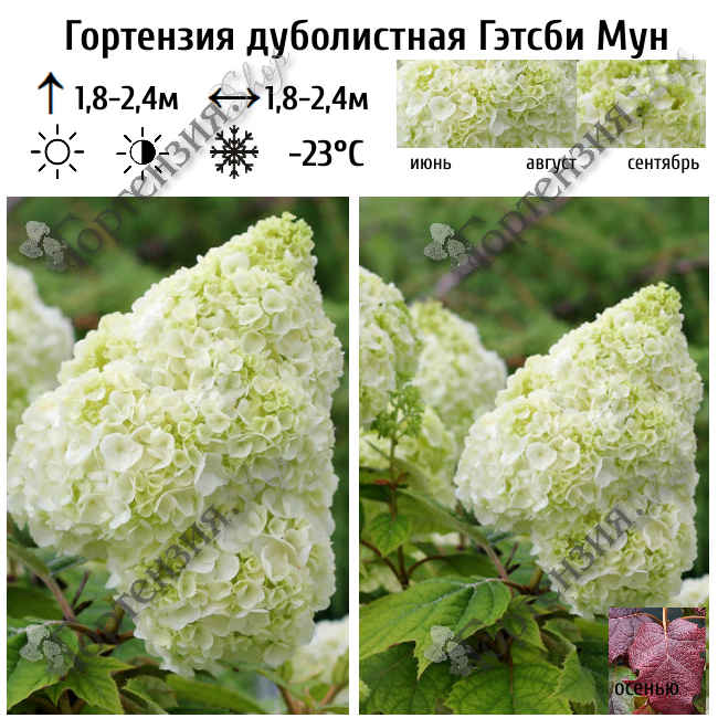 Куст декоративен весь сезон, даже если нет цветения. У гортензии «Gatsby Moon» большие очень плотно набитые соцветия-метёлки конусовидной формы, похожие на сорт «Harmony», но отличающиеся устойчивостью к атмосферным явлениям. Пухлые, набитые соцветия напоминают воздушное облачко. Они распускаются белыми и в течение лета переходят в лаймовый оттенок. Цветет с июня по октябрь. Морозостойкость-23°С. В первые годы посадки требует укрытия от вымерзания. В холодных регионах требует укрытия для цветения побегов прошлого года. В северных регионах рекомендовано полное солнце (в самые жаркие часы - полутень); в жарком климате - кружевная тень, полутень. Плодородная, суглинистая, желательно средне-кислая или кислая, с хорошим дренажом, с содержанием органики. Gatsby Moon очень красиво смотрятся в качестве акцента в саду, живой изгороди, прекрасно подходит для создании различных пейзажных композиций.