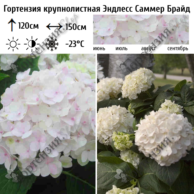 Гортензия крупнолистная Endless Summer 'The Bride' - это красивый кустарник с  белыми  шарообразными соцветиями. Высота этого декоративного кустарника может достигать 1,2-1,5 м, при диаметре кроны 1,5 м. Кусты с мощными пряморастущими побегами покрыты темно-зелеными достаточно большими листьями, которые служат отличным фоном для больших шаровидных соцветий. Ветви растения очень крепкие, ровные, поэтому этот сорт гортензии подходит для составления букетов. Стерильные цветочки собраны в своеобразные шарики, диаметр которых 10-16 см. Первое цветение наблюдается на прошлогодних побегах, повторное на молодых побегах. Период цветения - июнь-октябрь. Растет на плодородных, хорошо дренированных почвах, предпочитая кислые. Любит солнце или неглубокую тень. Нуждается в обильном поливе. Из всех гортензий этот сорт самый морозоустойчивый, выдерживает заморозки до -35 градусов без укрытия. Нуждается в весенней обрезке, при которой часть прошлогодних побегов лучше оставить, чтобы получить более обильное и раннее цветение.