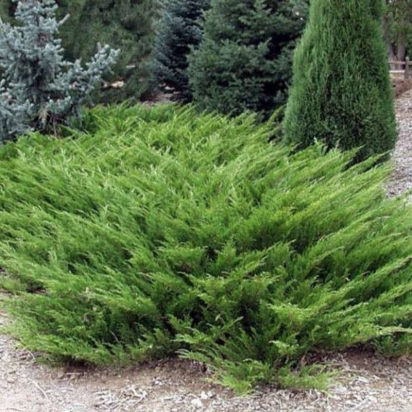 Можжевельник казацкий (Juniperus sabina): невысокий стелющийся кустарник, высотой до 100 см.В высоту растет довольно медленно, способен быстро разрастаться в ширину. Хвоя: у молодых растений игловидная, прямостоячая, сверху синевато-зеленая, мягкая, с четко выделяющейся срединной жилкой; у взрослых растений хвоя чешуевидная.Плоды: шишкоягоды округло-овальные длиной 5-12 мм, буро-черные с сизым налетом, содержат 2-4 семени. Несъедобные. Хорошо выглядит и в одиночных посадках, и в сочетании с другими хвойными, и в комбинации с листопадными деревьями и кустарниками.