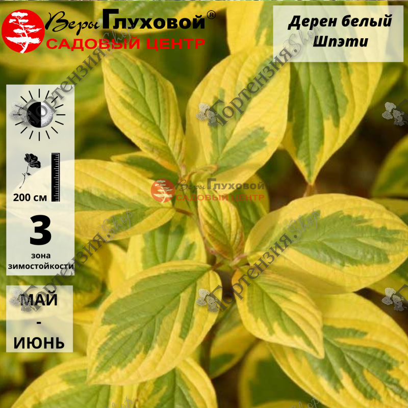 Дерен белый (Cornusalba) Шпэти- неприхотливый, листопадный, раскидистый кустарник семейства Кизиловых высотой и шириной 2,5-3 м. Стебли красные. Листья зеленые с желтым неравномерным окрасом, осенью фиолетовые. Цветки белой, чуть голубоватой окраски, соцветие щиток. Плод костянка, несъедобный.  Используется для одиночной и групповой посадки и как элемент живой изгороди.  Растет на любых плодородных почвах. Морозостиойкость -35 С.