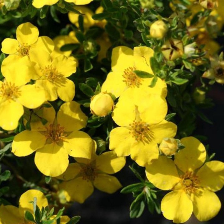 Лапчатка Белла Линдси (Potentilla fruticosa Bella Lindsey Hendlin) – куст компактный, густой, высотой и шириной 60-80 см. Не требует обрезки. Цветки ярко-жёлтые, не выгорают на солнце, осенью медленно приобретают тёплый оранжево-жёлтый оттенок. Цветёт обильно и длительно, с конца июня до заморозков. Листья тёмно-зелёные, устойчивые к болезням и вредителям. Идеальный сорт для патио, контейнеров и бордюров. Место солнечное. Почва дренированная. Зона 3 (до -40ºС).
