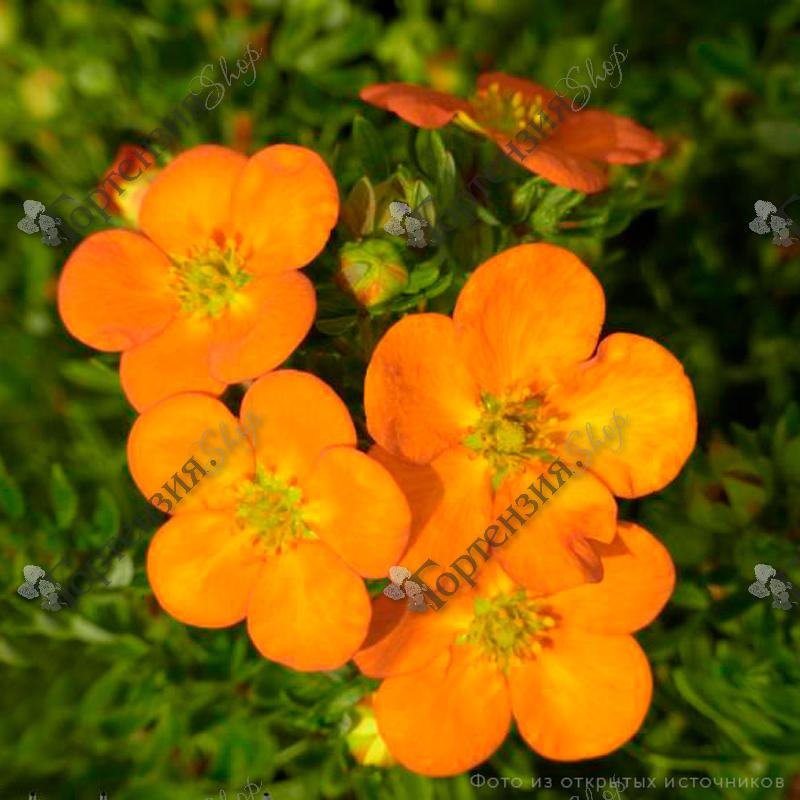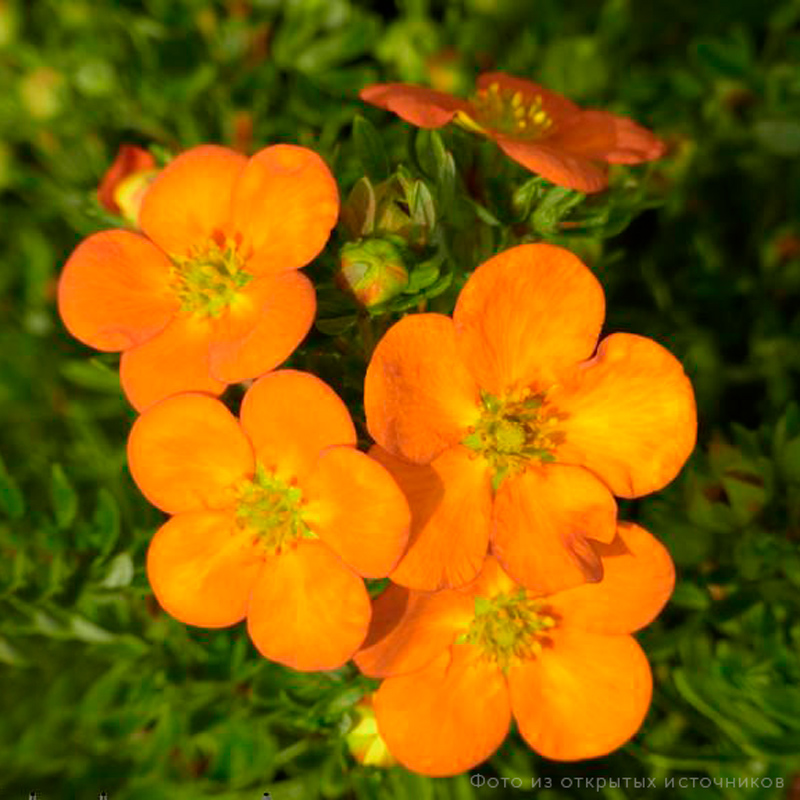 Цветки полумахровые, яркие, насыщенно-оранжевые, крупные, диаметром 5см, не выгорают по мере цветения. Пятилисточник кустарниковый. Необычайно выносливый, сильно ветвящийся кустарник. Обильно цветёт с июня по сентябрь. Предпочитает солнце, полутень. Почва умеренно влажная, плодородная.