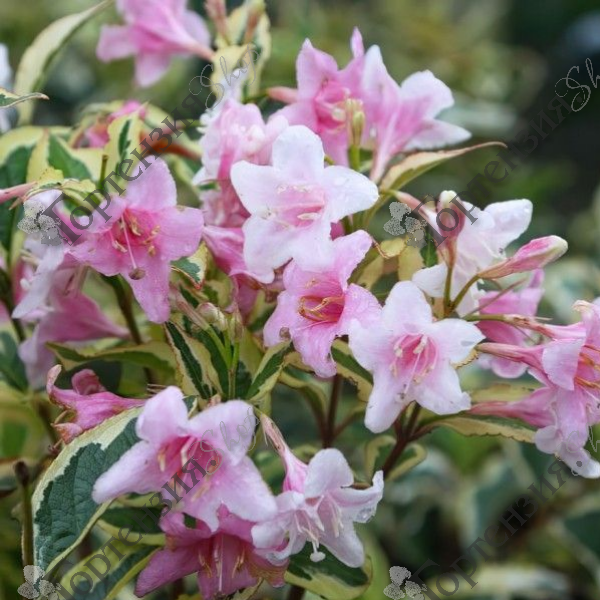 Вейгела цветущая  'Вариегата'Weigela florida' Variegata' - красивоцветущий,широкораскидистый  кустарник высотой до 150 см,Листья зеленые с белой каймой.Цветки разных оттенков: от белоснежного до розового,напоминают вытянутые колокольчики .Цветёт в мае-июне на прошлогодних побегах, любит плодородную почву и ежегодную обрезку после цветения, на зиму ветки пригибают к земле.