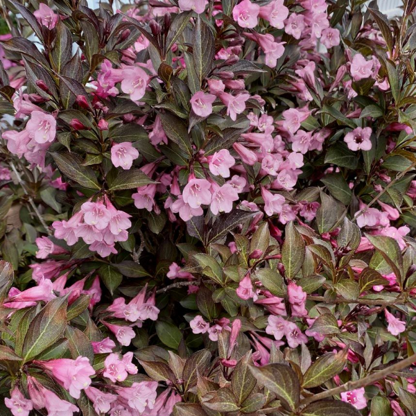 Вейгела цветущая Винтаж Лав (Weigela 'Vintage Love' ) Кустарник, высота 1,2 м, листья бордово-зеленые, заостренные, цветки розовые, цветёт в начале июня на прошлогодних побегах. Цветки трубчатые, образованы 5-ю лепестками, напоминают вытянутые колокольчики. Образуют соцветия  по 3 – 4 штуки в каждом. Источают приятный аромат. Место солнечное или полутенистое. Лучше всего подходят влажные хорошо дренированные и плодородные участки. Молодые побеги красно-бурые, зрелые - коричневые.