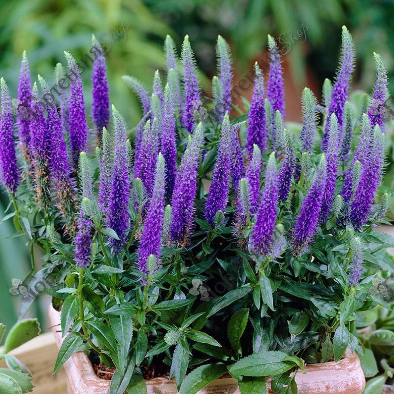 Вероника колосковая  'Улстер Дварф Блю' - высота взрослого растения до 35см.Плотный густой куст хорошо держит форму, не разваливается. Крепкое колосовидное синее соцветие со светло-зеленой "макушкой" украшает растение с середины июня до августа.Нуждается в хорошо дренируемых, богатых гумусом почвах. После обрезки отцветших соцветий зацветает второй раз за сезон.Может расти как на солнце, так и в полутени. Зимостойко.
