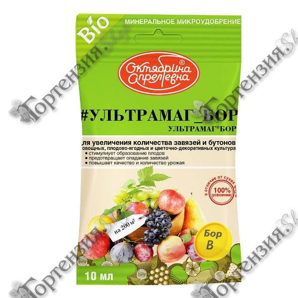 Жидкое удобрение, содержащее бор в легкоусваиваемой форме. Бор увеличивает количество завязей и бутонов на овощных, плодово-ягодных и цветочно-декоративных культурах.