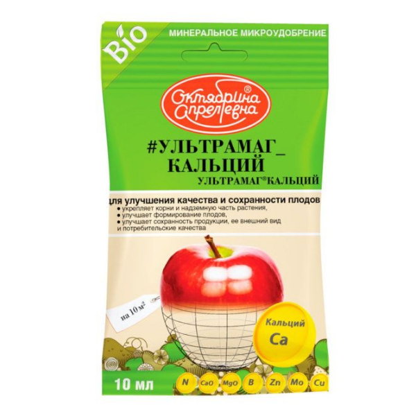 Удобрение биостимулятор "Ультрамаг Кальций",  с высоким содержанием кальция в легкоусвояемой растением форме. Предназначен для улучшения качества и сохранности плодов, укрепляет стебель, повышает прочность тканей растения, предотвращает пожелтение листьев. Подходит для плодовых, плодово-ягодных, косточковых, овощных, бахчевых, цветочно-декоративных культур, картофеля, земляники, винограда, и др.,